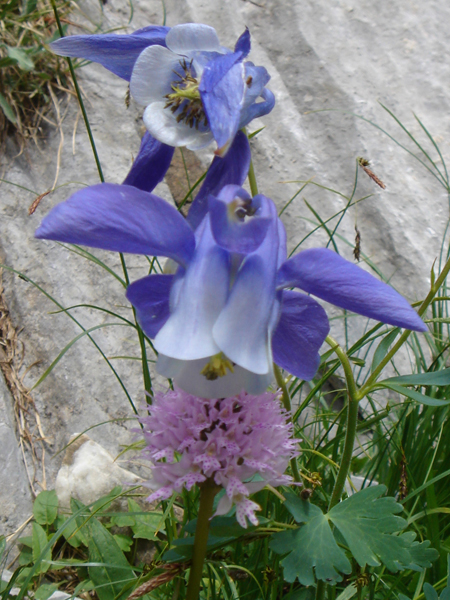 Bild rechts: Traunsteinera globosa Kugelorchis. Diese wird beschützt durch zwei Pflanzen der Alpen Akelei (Aquilegia alpina.)