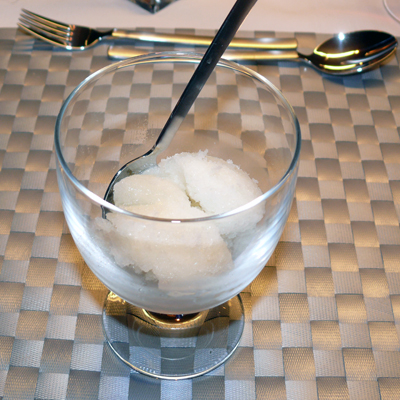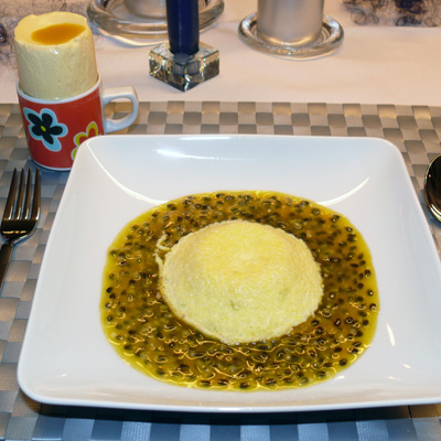 Quarktörtchen auf Passionsfruchtcoulis mit Soufleglacee